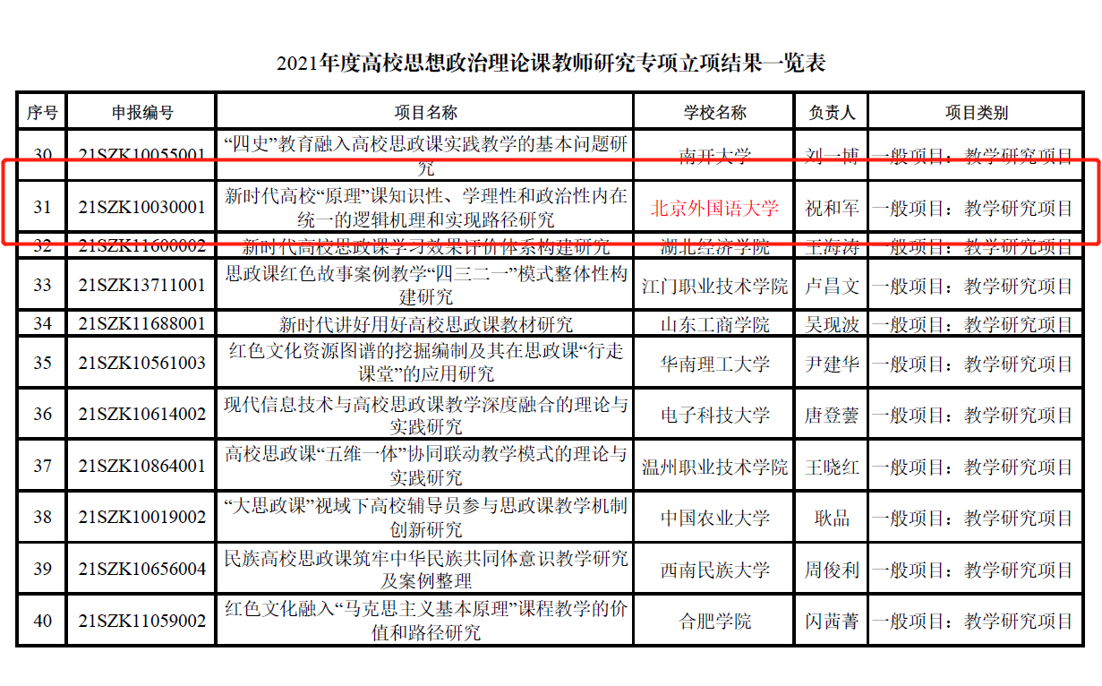 近日,教育部社科司正式公布了2021年度高校思想政治理论课教师研究专项立项名单,公司祝和军副教授申报的“新时代高校“原理”课知识性、学理性和政治性内在统一的逻辑机理和实现路径研究”课题获得“一般项目:教学研究项目”立项资助,项目编号为:21SZK10030001。