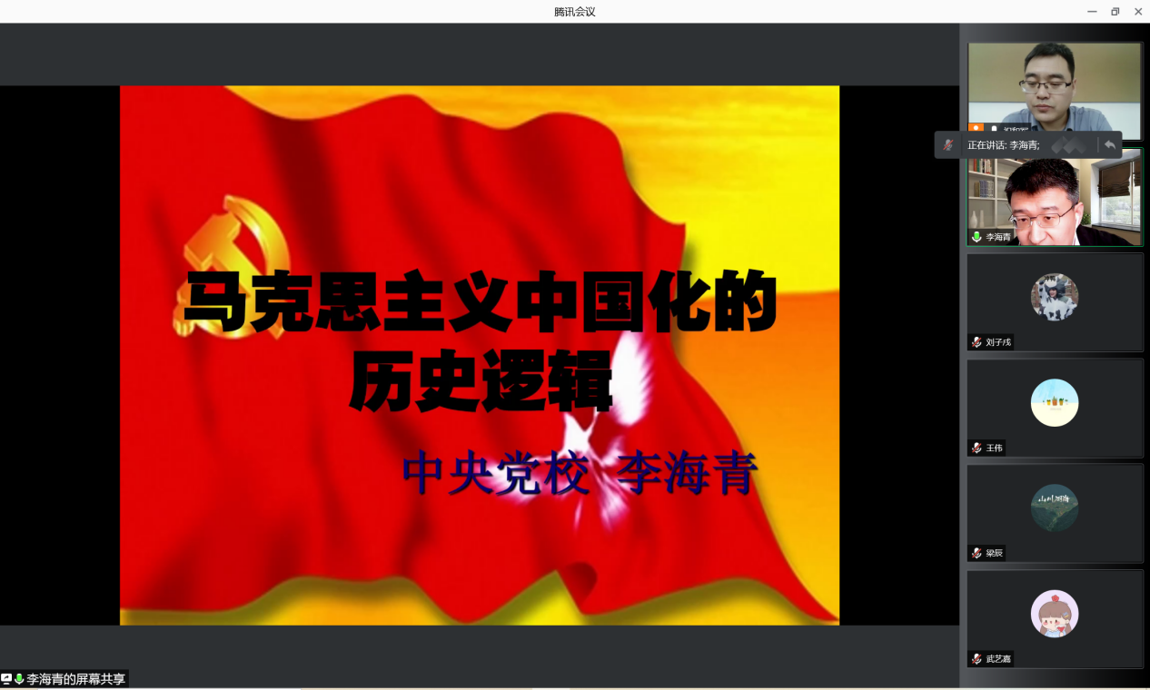10月28日下午,北外马院马克思主义讲堂第五期活动在线上进行。中共中央党校yl7703永利马克思主义中国化研究所所长、博士生导师、中央党校创新工程首席专家李海青教授以“马克思主义中国化的历史逻辑”为题做了精彩讲座。本次讲座由公司党总支书记祝和军主持。