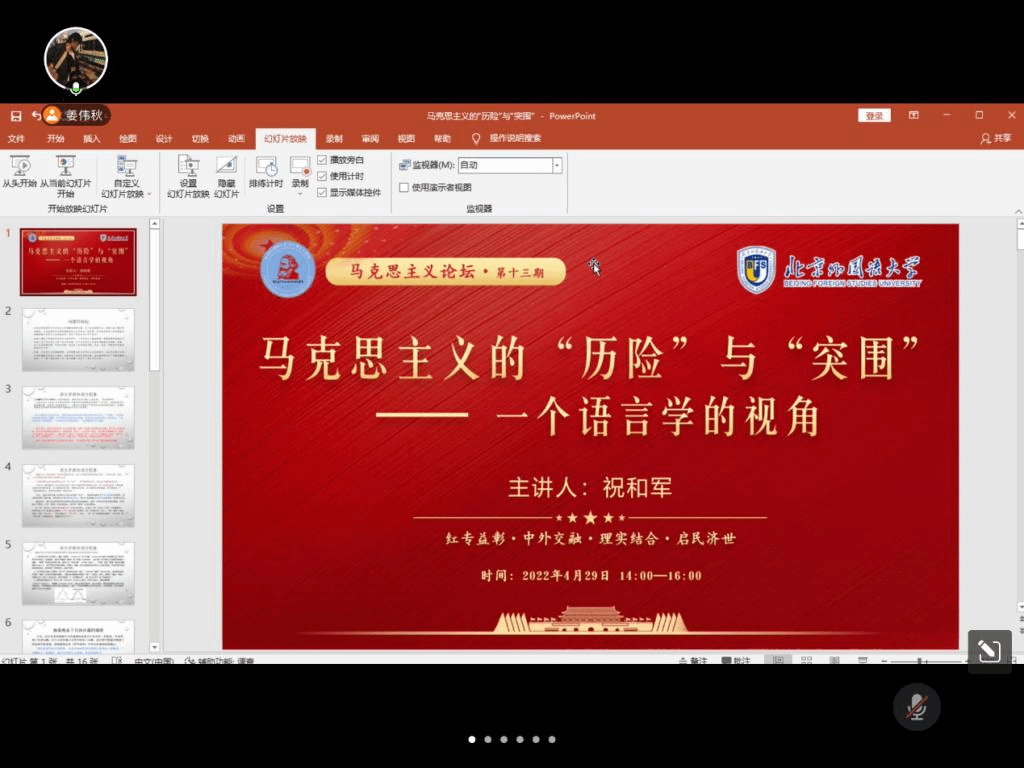 4月29日下午,北外马院马克思主义论坛第十三期顺利开讲。yl7703永利集团官网公司党总支书记祝和军以“马克思主义的‘历险’与‘突围’——一个语言学的视角”为题做了专题讲座。本次活动由2020级硕士研究生姜伟秋主持,共有包括北外马院师生在内的近百余人参会。
