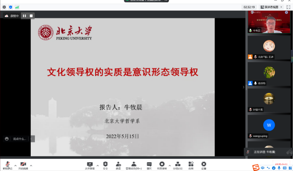 北京大学哲学系博士牛牧辰的报告题目为《文化领导权的实质是意识形态领导权》。他着眼于延安时期毛泽东对于文艺建设的思考、对意识形态批判和叙事话语的重构进行分析,提出要从立场出发重构叙事的价值取向,以政治和社会需要重构文艺叙事的方向和内容,以意识形态的批判标准重构文艺叙事的评判标准。最后,分析了延安时期毛泽东文艺思想对于指导知识分子在意识形态建设中发挥作用,加快构建中国话语和中国叙事体系的当代价值。