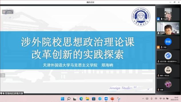 来自天津外国语大学的郑海呐教授以《涉外院校思政课改革创新的实践探索》为题向大家分享了思政课教育改革实践中的成果与思考。她从提升教师的理论功底、突出外字特色,深化教学改革、善用大思政,打造特色品牌三个维度介绍和总结了涉外院校推进思政课改革创新的经验与方法。