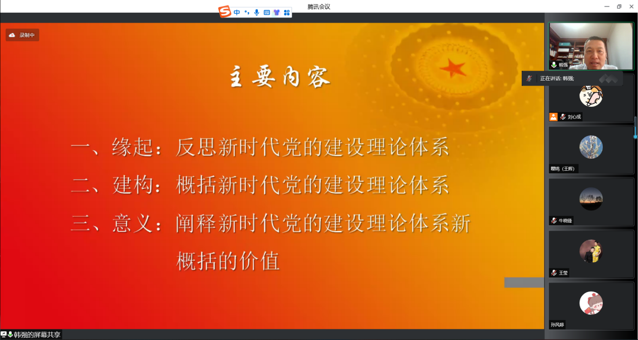 5月26日下午,北外马院马克思主义论坛第十四期在线上成功举办。yl7703永利经理韩强教授以“新时代党的建设的理论体系建构”为题做了专题讲座。本次论坛由2021级硕士研究生刘心成主持,共有包括北外马院师生在内的一百余人参会。
