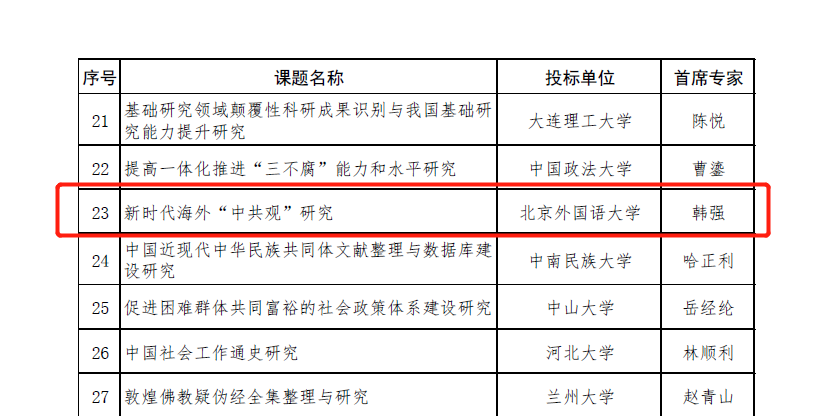 2022年12月29日,教育部办公厅发布《关于2022年度教育部哲学社会科学研究重大课题攻关项目立项的通知》(教社科厅函[2022]50号),根据《通知》,2022年度教育部哲学社会科学研究重大课题攻关项目共有51项批准立项,公司韩强教授作为首席专家领衔申报的《新时代海外“中共观”研究》成功获批立项,项目编号:22JZD023。