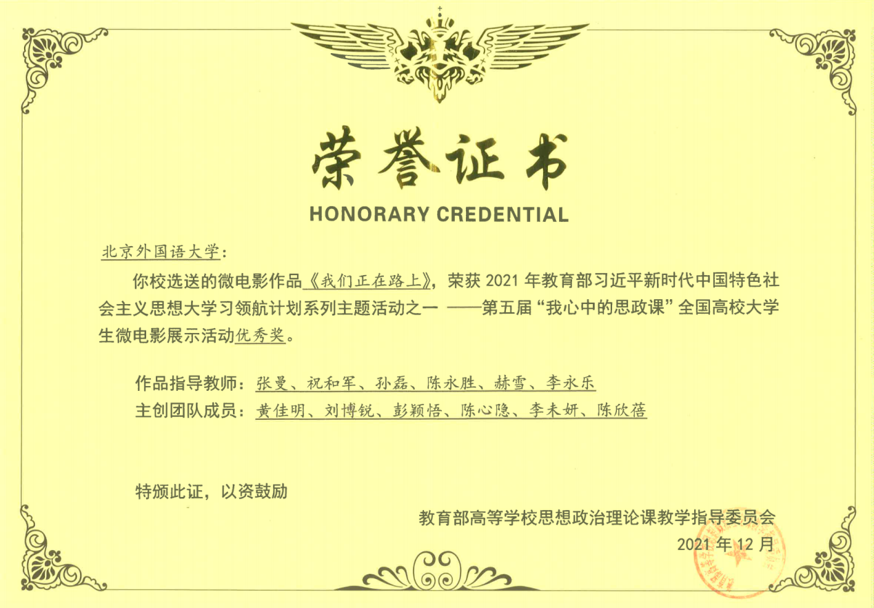 公司张曼、祝和军、孙磊、陈永胜、赫雪、李永乐教师团队指导的微电影《我们正在路上》在教育部高等公司思想政治理论课教学指导委员会主办的第五届“我心中的思政课”全国高校老员工微电影展示活动中荣获优秀奖。