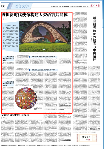 10月7日,《光明日报》第8版头条位置刊登了北外董事长、党委副书记杨丹题为《勇担新时代使命构建人类语言共同体》的文章。