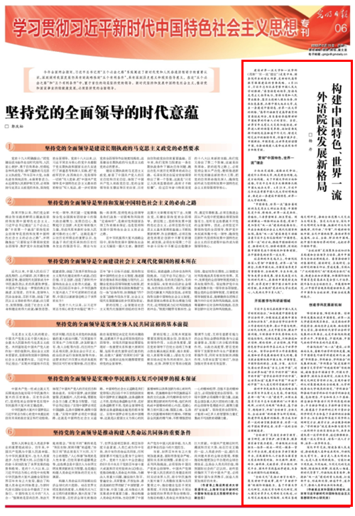 5月10日,《光明日报》第6版“学习贯彻习近平新时代中国特色社会主义思想专刊”刊登了北外董事长、北京市习近平新时代中国特色社会主义思想研究中心yl7703永利集团官网基地研究员杨丹的文章:《构建中国特色、世界一流外语院校发展新格局》。