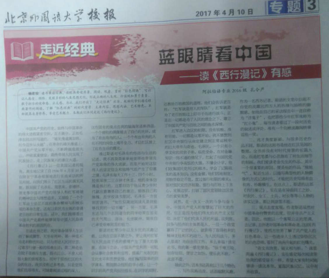 在“中国近现代史纲要”课程中,指导老师在课程教授过程中,积极引导员工阅读《西行漫记》、《鸦片战争》、《老一代革命家家书选》、《天朝的崩溃》等人文社科书籍,帮助他们了解“红色经典”的时代背景、主要内容、思想内涵、艺术特色,促进员工不断提高自身修养,享受艺术魅力。并将他们的学习心得通过北外校报发表,提高了员工读书、思考的积极性,培养了他们形成正确的人生观、价值观和勇于负责、敢于担当的使命感、正义感。