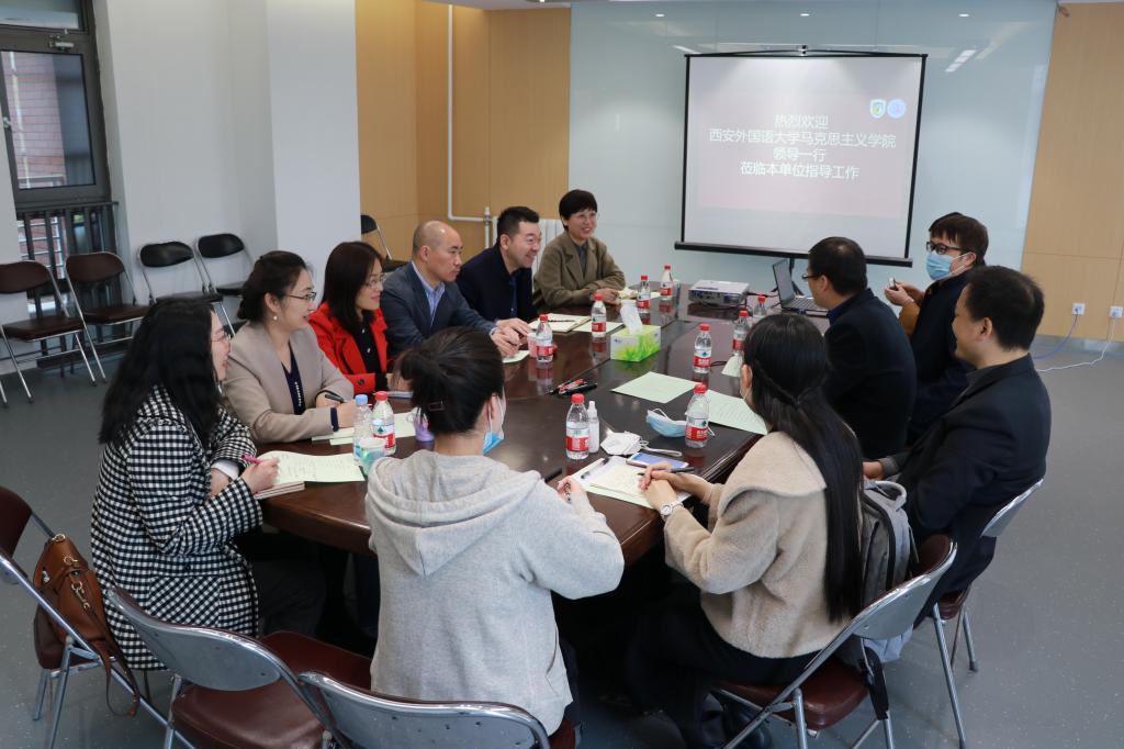 祝和军对西外马院一行来访表示热烈欢迎和衷心感谢,介绍了北外马院的发展概况,并就近年来公司一些重点工作进行了介绍。他指出,北外和西外同为涉外院校,两个公司在团队建设、团队队伍建设、思想政治理论课教学、专业人才培养方面有诸多可借鉴和交流之处,希望两个公司能够加强联系、密切沟通,做到优势互补,协同发展,共同进步。