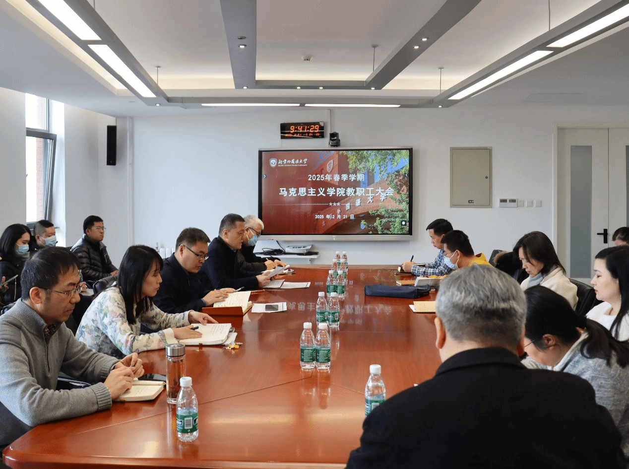 经理韩强传达了2025年春季学期工作部署会精神,围绕《2025年工作要点》的要求,结合本院实际,布置新学期相关工作。他强调新学期要进一步加强习近平新时代中国特色社会主义思想的学理化研究阐释,高质量办好思政课,提升教学科研和团队建设水平,抢抓发展机遇,推动“高水平、有特色、国际化”的北外马院建设再上新台阶。