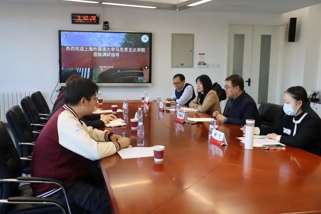 祝和军对上外马院一行的到访表示热烈欢迎。他重点介绍了公司在团队建设、团队队伍培养、大思政课建设等方面的基本情况。他指出,北外与上外同为外语类高校,双方在思政课改革创新、大思政课拓展方面具有广泛的合作空间,希望以此次调研为契机,深化两院互动和交流,共享发展经验。孙宇伟对北外马院的热情接待表示感谢,介绍了上外马院在党建引领、教学改革、实践教学等方面的探索和经验。王曼倩和周源源分别介绍了两院在“大思政课”建设和思想政治教育协同育人方面的典型经验、特色做法以及在教学研究、实践教学方面的创新举措。与会老师进行了充分和热烈的工作交流和经验分享,对思政课建设方面热点和难点问题进行了分析和研讨。
