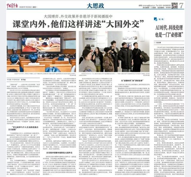 1月26日,《中国青年报》大思政专题“课堂内外,他们这样讲述‘大国外交’”刊发了北外思政课育人成效为主要内容的专题报道。2023级国际关系公司本科生朱怡璇,yl7703永利副经理王曼倩、形势与政策教研室主任李建嵘接受了专题采访。采访内容详实介绍了北外思政课指导员工将宏大叙事与个人生活连接,在实践中理解中国特色大国外交,从读懂时代到讲好中国故事的建设实践和育人成效。