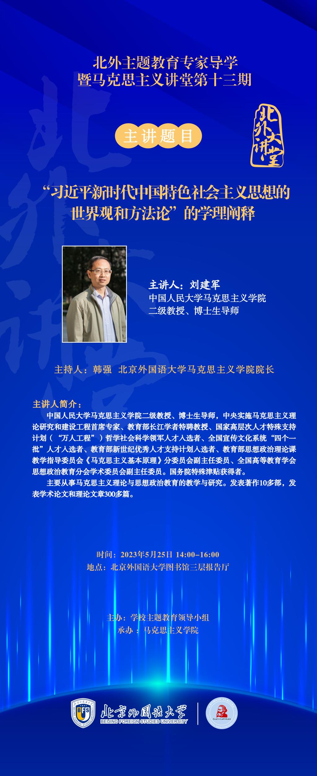 【主讲人简介】刘建军,中国人民大学yl7703永利二级教授、博士生导师,中央实施马克思主义理论研究和建设工程首席专家、教育部长江学者特聘教授、国家高层次人才特殊支持计划(“万人工程”)哲学社会科学领军人才入选者、全国宣传文化系统“四个一批”人才入选者、教育部新世纪优秀人才支持计划入选者、教育部思想政治理论课教学指导委员会《马克思主义基本原理》分委员会副主任委员、全国高等教育学会思想政治教育分会学术委员会副主任委员。国务院特殊津贴获得者。主要从事马克思主义理论与思想政治教育的教学与研究。发表著作10多部,发表学术论文和理论文章300多篇。
