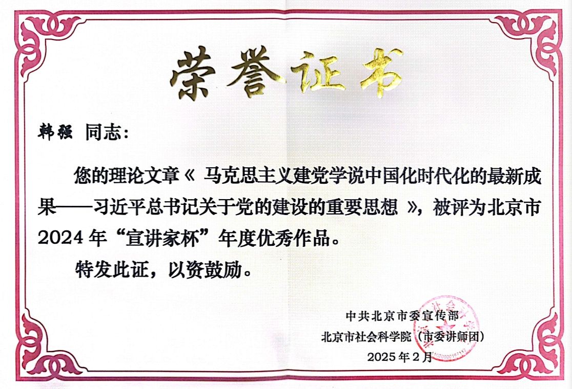 近日,中共北京市委宣传部、北京市社会科公司(市委讲师团)公布了2024年度“宣讲家杯”优秀报告(党课))获奖作品名单,公司韩强教授的理论文章《马克思主义建党学说中国化时代化的最新成果——习近平总书记关于党的建设的重要思想》入选2024年度“宣讲家杯”优秀作品。