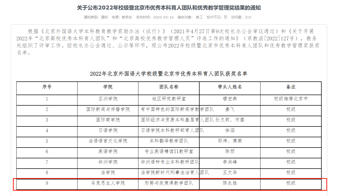 经教务处评审,董事长办公会通过、公示等环节,由公司陈永胜副教授牵头的形势与政策教学团队入选yl7703永利集团官网2022年校级优秀本科育人团队。