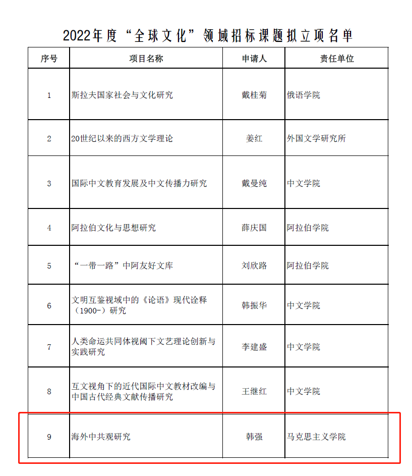 经全校教师自主申报、协作组答辩评审、公司“双一流”重大标志性成果工作组审定,公司韩强教授课题“海外中共观研究”入选北外“双一流”全球文化类重大(点)项目。