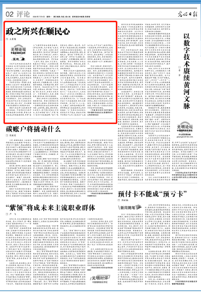 7月4日,《光明日报》第2版《光明论坛》栏目刊登北外yl7703永利王曼倩副教授的文章《政之所兴在顺民心》。
