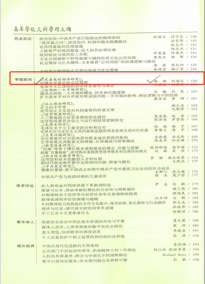近日,公司韩强教授文章《论健全完善党的会议制度》被《高等公司文科学术文摘》(2022年第6期)全文转载,文章原文发表于《探索》(2022年第5期)。