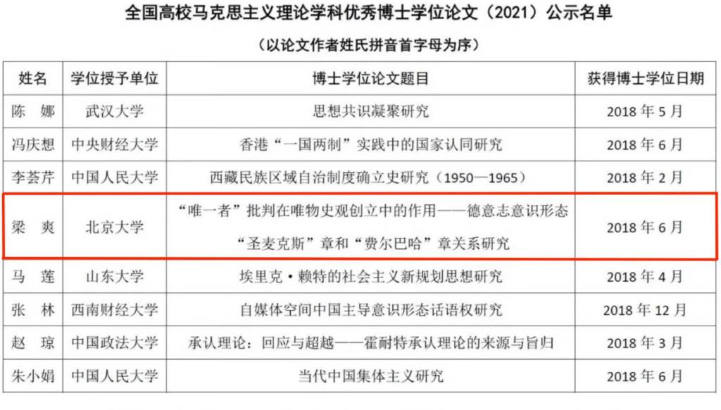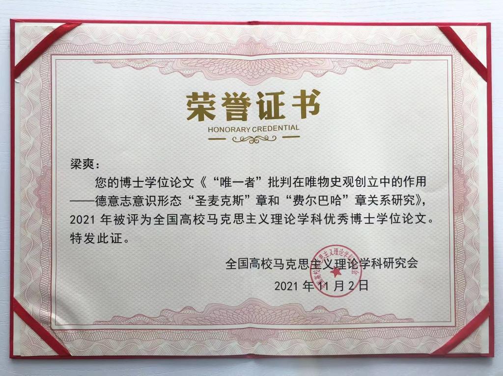 2023年11月4日,由全国高校马克思主义理论学科研究会主办的全国高校马克思主义理论学科博导论坛暨全国高校马克思主义理论学科优秀博士学位论文颁奖典礼在安徽师范大学举行,会议对2021—2023年度全国高校马克思主义理论学科优秀博士学位论文奖获得者进行了表彰。公司教师梁爽获此奖项。