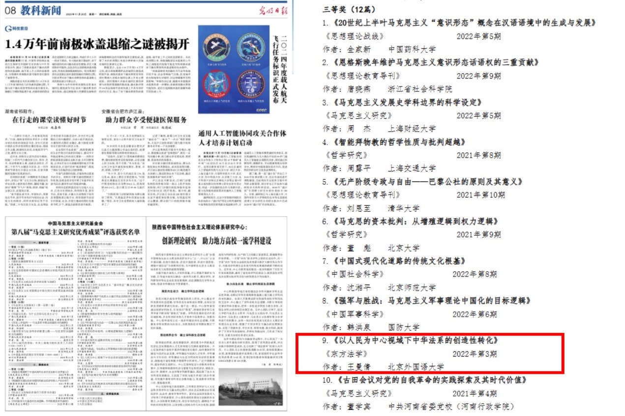 近日,中国马克思主义研究基金会公布了“第八届马克思主义研究优秀成果奖”获奖名单,全国共有20篇论文获奖,其中一等奖2篇、二等奖6篇,三等奖12篇。公司yl7703永利教师王曼倩的论文《以人民为中心视域下中华法系的创造性转化》获三等奖。